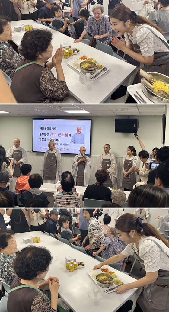 복지관을 방문한 스님들은 온열찜질기와 양우산을 비롯해 갈비탕, 동태전, 해물완자와 송편 등 푸짐한 추석 특식 밥상을 선물했다. 김소유는 '10분 내로' 등을 부르며 행사장 분위기를 흥겹게 띄웠다.