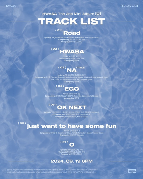 공개된 트랙리스트에 따르면, 화사의 새 앨범 '오'에는 타이틀곡 '나(NA)'를 비롯해 '로드(Road)', '화사(HWASA)', '에고(EGO)', '오케이 넥스트(OK NEXT)', '저스트 원트 투 해브 썸 펀(just want to have some fun)', '오'까지 일곱 곡이 수록된다.