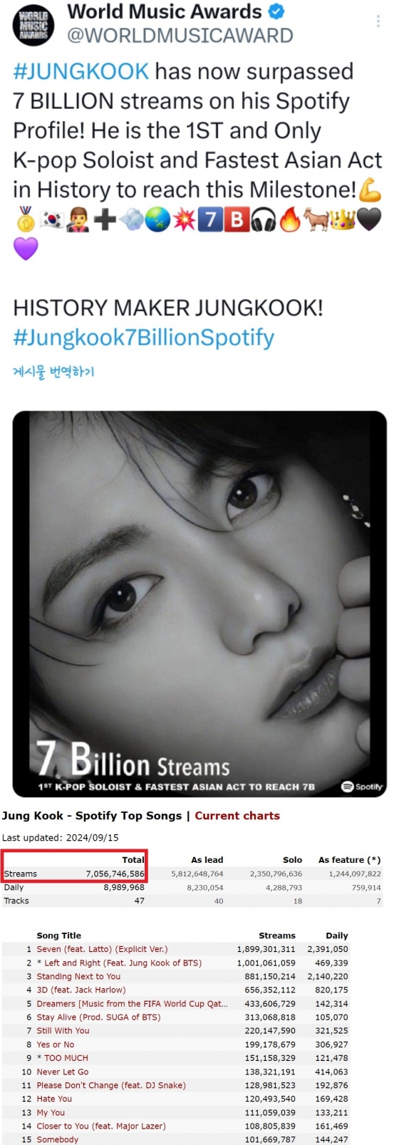 '월드뮤직어워드'(WMA)에 따르면, 정국은 스포티파이 개인 계정으로 70억 스트리밍에 도달한 최초이자 유일한 K-팝 솔로 가수이자 가장 빠르게 이 같은 기록을 달성한 아시아 아티스트라는 새 역사를 썼다.