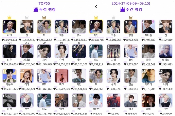 또한 케이돌 레코드 '일일랭킹 최장 1위' 부문에서 1위부터 5위까지 독차지하고 있는 지민은 9월 19일 자 일일랭킹에서도 428만 9460 하트를 얻으며 총 1131회 최다 1위를 기록, 2위와는 1천 회 가까운 압도적 차이로 막강 팬덤 화력을 보여줬다.