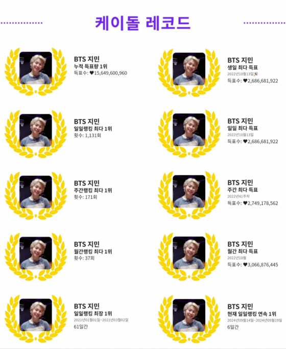 지민은 9월 19일 기준, 누적 득표량 1위(156억 4960만 960), 일일랭킹 최다 1위(1131회), 주간랭킹 최다 1위(171회), 월간랭킹 최다 1위(37회), 일일 최다 득표(26억 8668만 1922), 주간 최다 득표(27억 4917만 8562), 월간 최다 득표(30억 6687만 6445), 생일 최다 득표(26억 8668만 1922), 일일랭킹 최장 1위(61일간), 일일랭킹 연속 1위(6일간) 등 명예의 전당 총 10관왕을 싹쓸이했다.