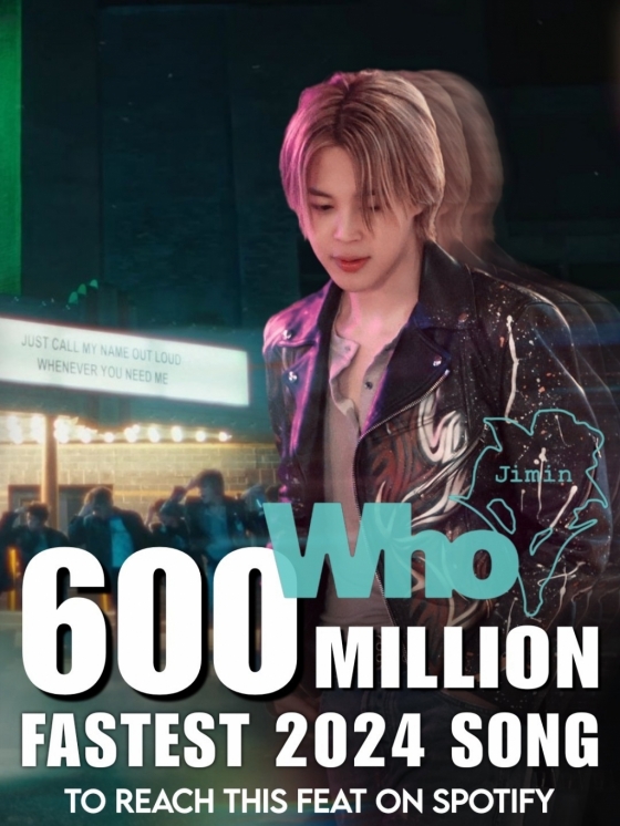 방탄소년단(BTS) 지민의 신곡 'Who'(후)가 세계 최대 음원 플랫폼 스포티파이(Spotify)에서 2024년 최단기간 6억 스트리밍을 돌파했다.