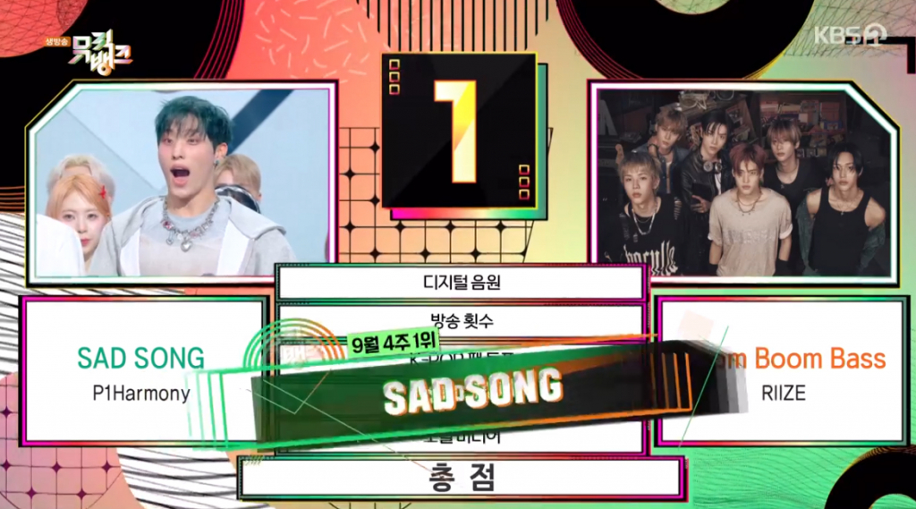 피원하모니는 27일 방송된 KBS 2TV '뮤직뱅크' K-차트에서 'SAD SONG'으로 라이즈 'Boom Boom Bass'를 제치고 1위에 올랐다.