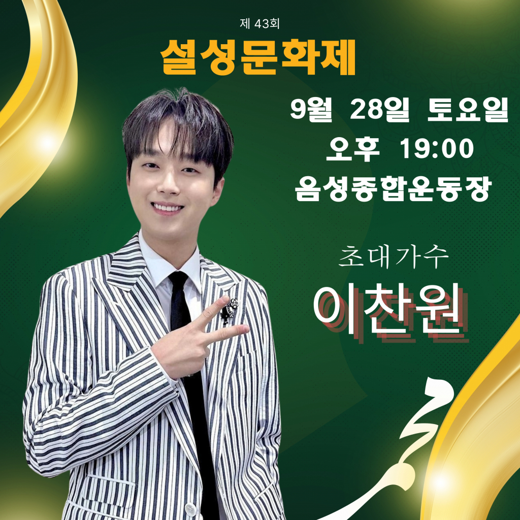 이찬원은 9월 28일 오후 7시 충북 음성군 음성읍 설성로 음성종합운동장에서 열리는 '제43회 설성 문화제' 축하 공연에 출연한다.