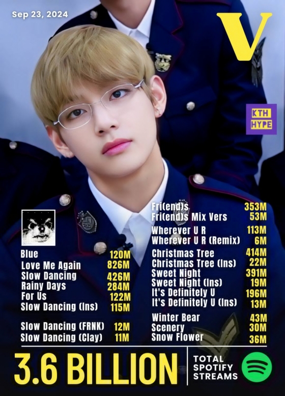 뷔의 스포티파이 프로필에 크레딧된 곡들은 지난 9월 22일 총 36억 스트리밍을 돌파했다.