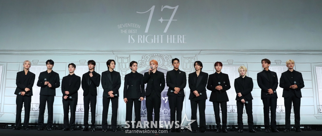 [서울=뉴시스] 김혜진 기자 = 그룹 세븐틴이 29일 오후 서울 영등포구 여의도 콘래드 호텔에서 열린 세븐틴 베스트 앨범 '17 IS RIGHT HERE' 발매 기념 글로벌 기자간담회에서 인사말을 하고 있다. 2024.04.29. jini@newsis.com /사진=김혜진