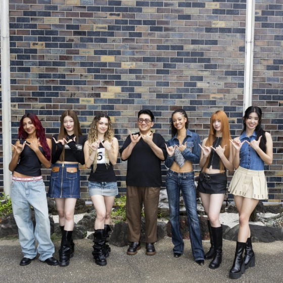 사진 속 방시혁은 캣츠아이(KATSEYE) 멤버들과 함께 신곡 'Touch' 포인트 안무를 선보이고 있는 모습. 방시혁은 환한 미소로 캣츠아이와 훈훈한 분위기를 자아내고 있다.