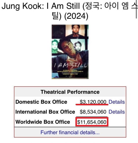 영화 흥행 통계와 티켓 판매량, 박스오피스 순위 등을 제공하는 사이트인 'The Numbers(더 넘버스 닷컴)에 따르면, '정국: 아이 엠 스틸'(JUNG KOOK: I AM STILL)은 9월 18일 개봉 이후 9월 29일까지 11일 만에 전 세계에서 1165만 달러(한화 약 153억원) 이상의 수익을 창출했다.
