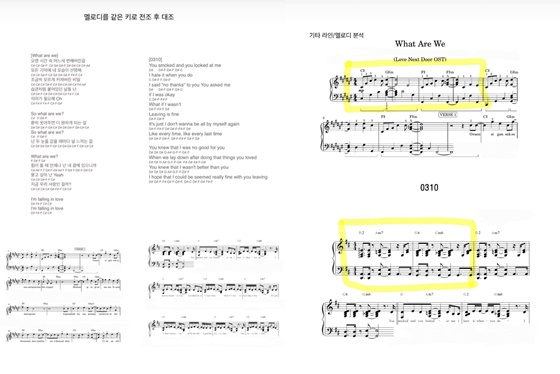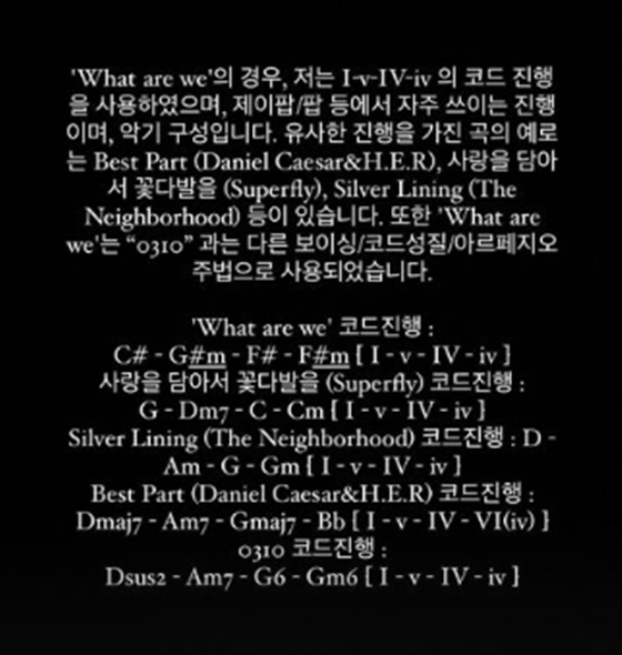 이와 함께 그는 '왓 아 위'와 '0310'의 코드와 멜로디, 진행 등을 정리한 악보를 첨부했다.