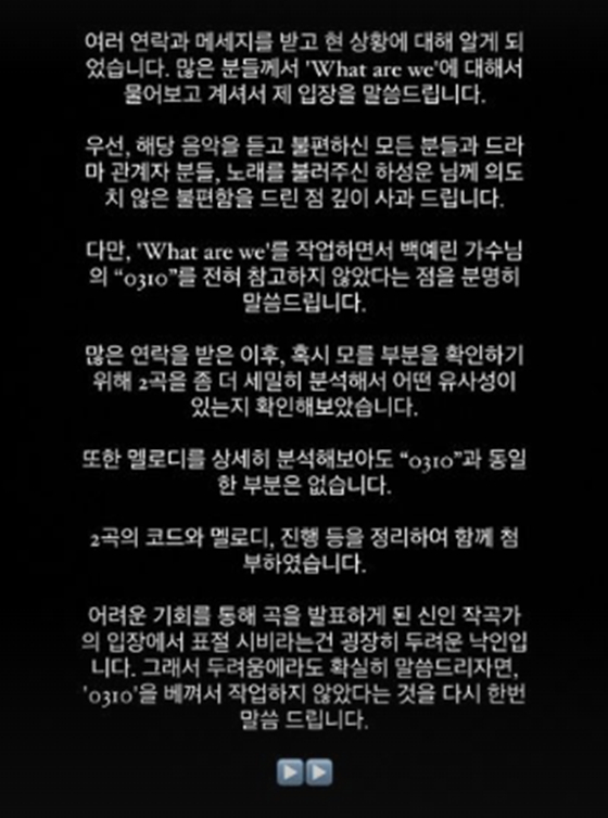 해당 작곡가는 "어려운 기회를 통해 곡을 발표하게 된 신인 작곡가의 입장에서 표절 시비라는 건 굉장히 두려운 낙인"이라며 "확실히 말씀드리자면, '0310'을 베껴서 작업하지 않았다"고 재차 해명했다.