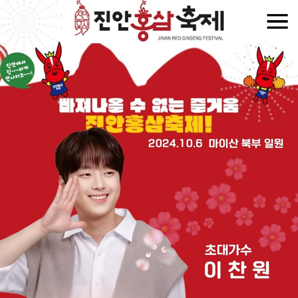 이찬원은 10월 6일 오후 6시 전북 진안군 마령면 동천리 마이산 북부 일원에서 열리는 '2024 진안홍삼축제' 폐막 공연에 출연한다.