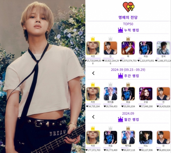 지민은 총 50개월 동안 진행된 케이돌 월간랭킹에서 과반이 훌쩍 넘는 기간동안 1위를 달리고 있다. 지민은 이에 앞서 마감된 9월 마지막주 주간랭킹(9월 23일 ~ 9월 29일)에서도 3473만 5184표를 획득해 자신이 세운 최장 기록을 173주로 연장하며 우승을 차지하는 저력을 과시했다.