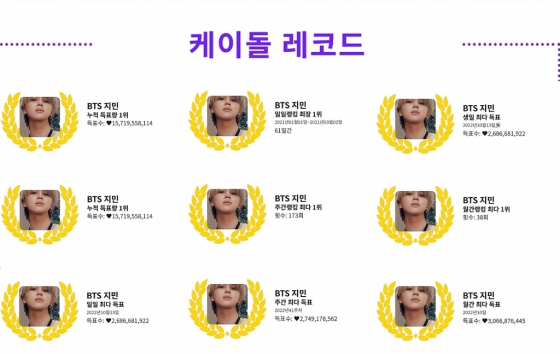 지민은 10월 5일 기준 누적 득표수 157억 1884만 4638 표를 기록, 2위와 압도적인 차이로 케이돌 명예의 전당 1위를 질주하고 있으며, 케이돌 레코드 '일일랭킹 최장 1위' 부문에서도 1136회 1위를 기록하며 넘볼 수 없는 기록을 써내려 가고 있다.