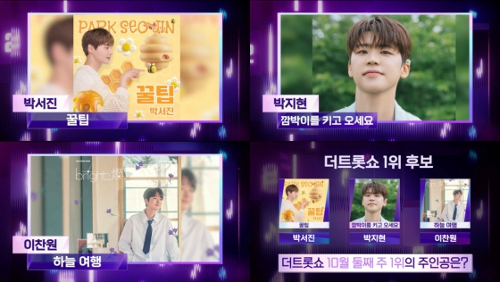 1위 후보곡은 봄부터 가을까지 꾸준히 상위권에서 인기를 유지하고 있는 이찬원의 '하늘 여행'과 독보적인 음색과 장구 퍼포먼스로 큰 사랑을 받고 있는 박서진의 '꿀팁', 유쾌한 에너지를 전하며 모두의 마음을 사로잡은 박지현 '깜빡이를 키고 오세요'가 선정됐다.
