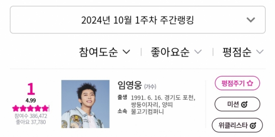 임영웅은 10월 1주차 아이돌차트 평점랭킹에서 38만 6472표를 얻어 1위를 차지했다.