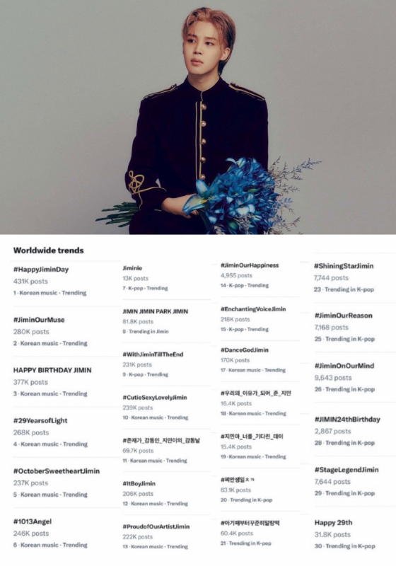 또 '#29YearsofLight', '#OctoberSweetheartJimin', '#1013Angel', JIMIN JIMIN, Park Jimin, '존재가_감동인_지민이의 감동날' '#근데우리지민이너무잘자랐죠' 등의 관련 해시태그 및 키워드가 전세계 실시간 트렌드 1위부터 21위까지 줄을 세웠다.