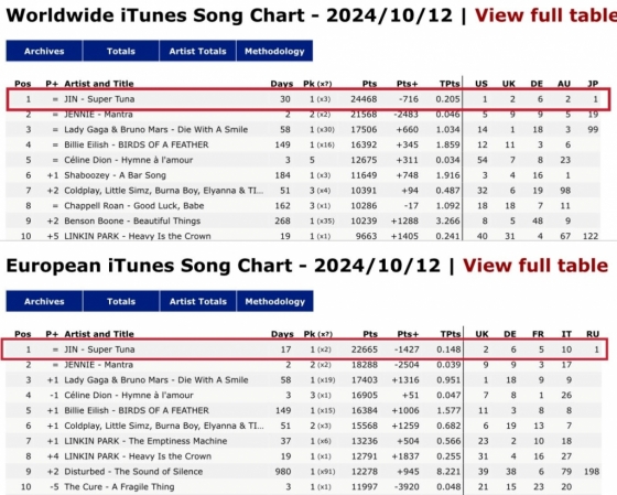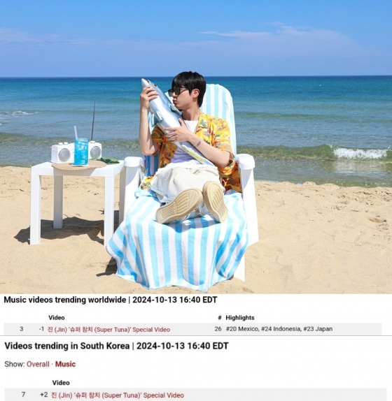 방탄소년단(BTS) 진의 '슈퍼 참치'(Super Tuna)가 이틀째 전 세계에서 1위를 휩쓸며 최고 글로벌 슈퍼스타 위상을 빛냈다.