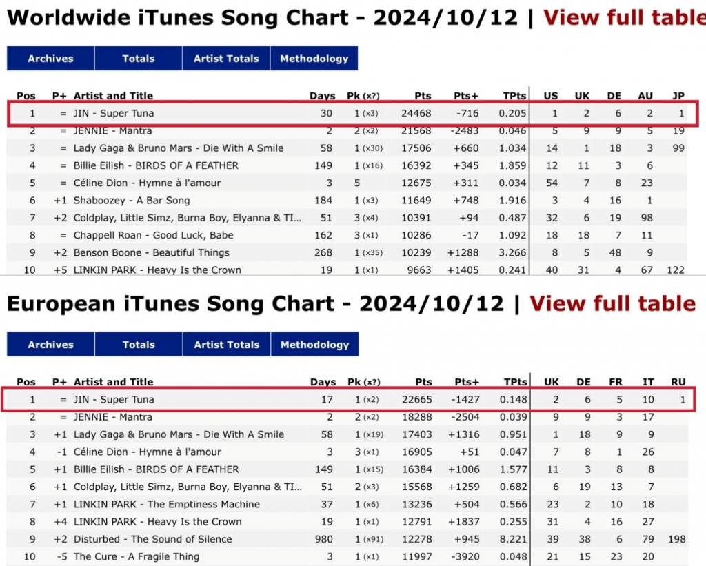 진의 '슈퍼 참치' 완곡 버전은 발매되자마자 순식간에 전 세계 아이튠즈와 유럽 아이튠즈 송 차트에서 모두 1위를 기록했으며 이틀째(10월 12일자)에도 각각 1위를 차지했다. 미국 아이튠즈(iTunes)에서도 역시 발매 즉시 단숨에 1위를 차지했으며 이틀째 1위를 기록했다.