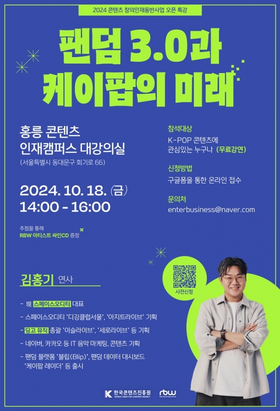 RBW는 18일 오후 2시 서울 동대문구 한국콘텐츠진흥원 콘텐츠인재캠퍼스 대강의실에서 '2024년 콘텐츠 창의인재동반사업' 오픈특강을 개최한다. 이번 오픈특강은 한국콘텐츠진흥원(원장 직무대행 유현석)에서 주관하는 콘텐츠 창의인재동반사업의 일환으로 진행되며, 스페이스오디티의 김홍기 대표가 강연자로 나선다.