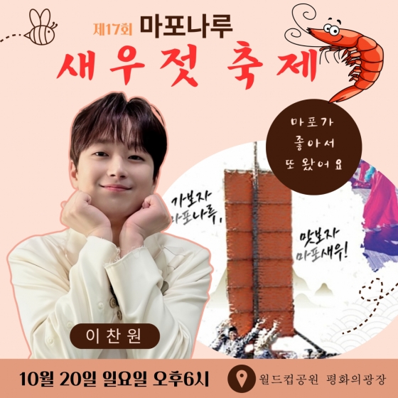 마포나루 새우젓 축제는 조선시대 새우젓 장터였던 마포나루를 현대식으로 재현한 행사로 이찬원은 2022년에 이어 올해 두 번째로 초대돼 무대를 장식한다.