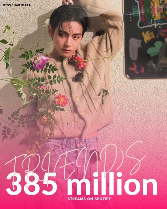 방탄소년단(BTS) 뷔의 '프렌즈'(FRI(END)S)가 스포티파이(Spotify)에서 3억 8500만 스트리밍을 돌파하며 인기를 빛냈다.