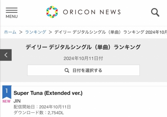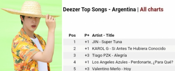 진의 '슈퍼참치'는 10월 21일(한국 시간) 발표된 글로벌 스트리밍 플랫폼 '디저'(deezer) 톱송 아르헨티나 1위(10월 19일자)를 차지했다.