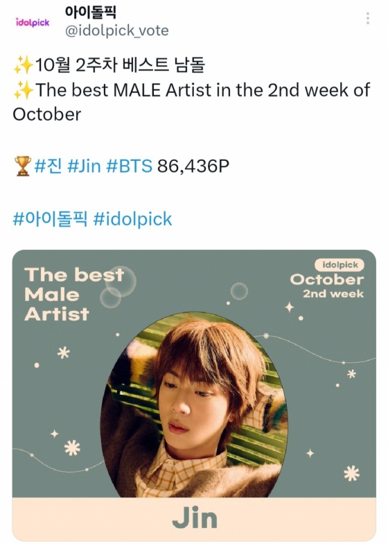 방탄소년단 진, 아이돌픽 10월 2주차 베스트 남돌 1위..4주 연속 'No.1'