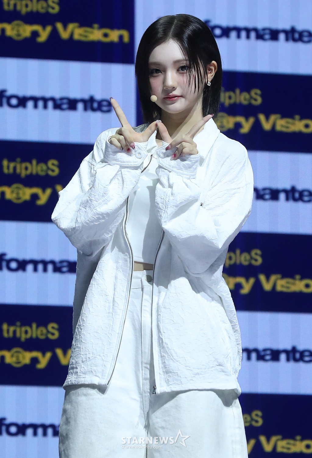 걸그룹 트리플에스 Vision@ry Vision(이하 VV) 연지가 23일 오후 서울 광진구 예스24 라이브홀에서 진행된 첫 앨범 'Performante' 발매 기념 쇼케이스에 참석해 포즈를 취하고 있다.
