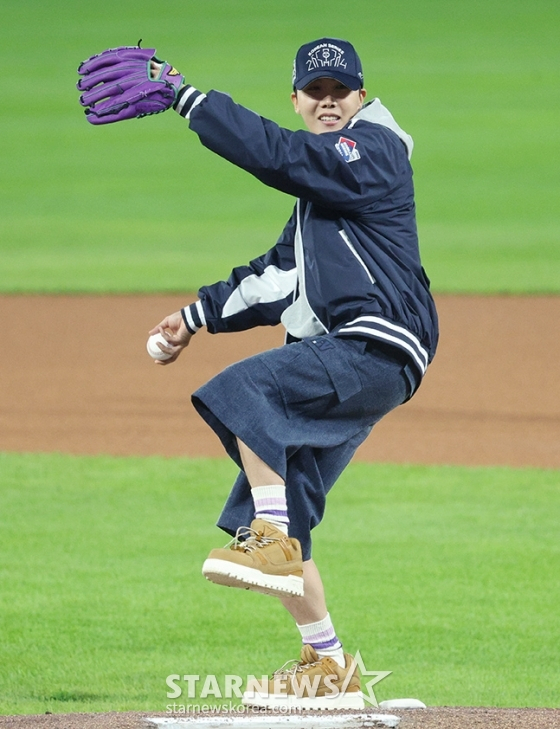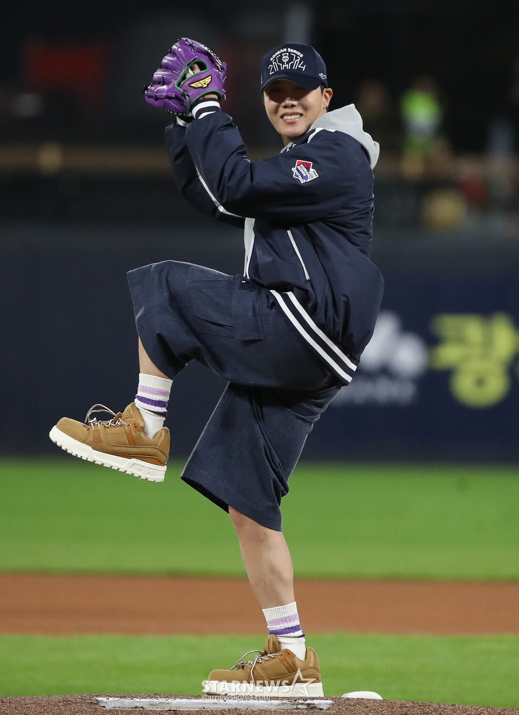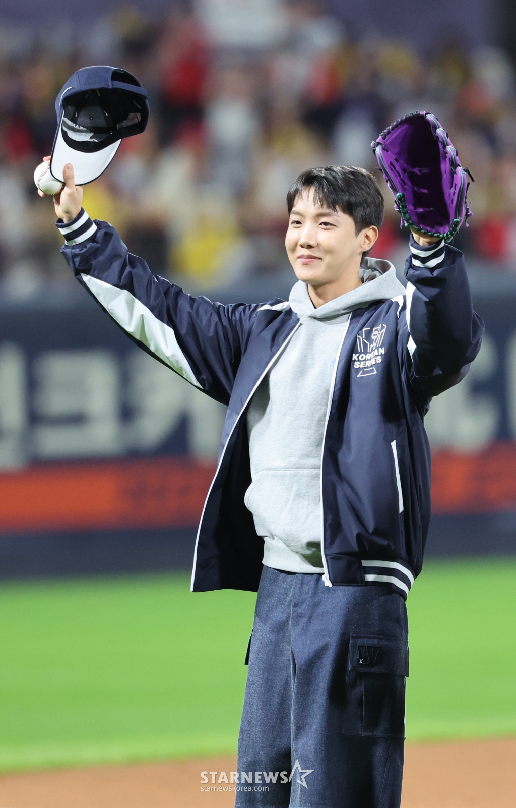 이날 제이홉은 캐주얼한 룩을 입고 등장했다. 그레이 후드에 네이비 컬러의 재킷으로 스포티한 느낌을 살렸다. 특히 방탄소년단을 상징하는 보라색 글로브를 끼고 마운드에 올라 공을 던져 의미를 더했다.