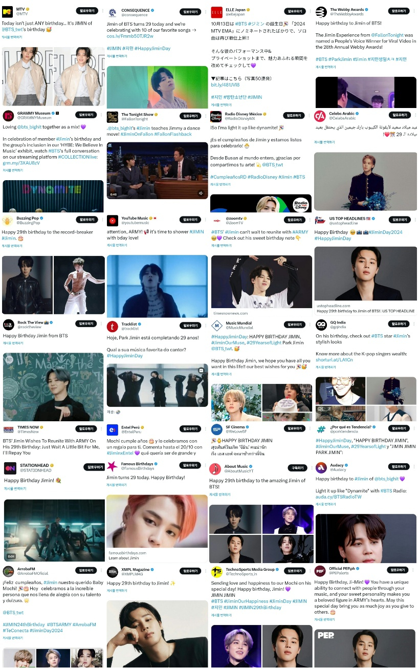 한편, 지민은 생일 당일 엑스(구 트위터)에서 26개 전 세계 실시간트렌드를 동시 점령하며 6년 연속 유일한 생일 신기록을 달성해 팬들의 뜨거운 사랑을 실감케 함과 동시 글로벌 공식 계정들과 매체, 유명 셀럽들의 끝없는 축하로 글로벌 잇 보이이자 진정한 슈퍼스타 면모를 재확인시켰다.