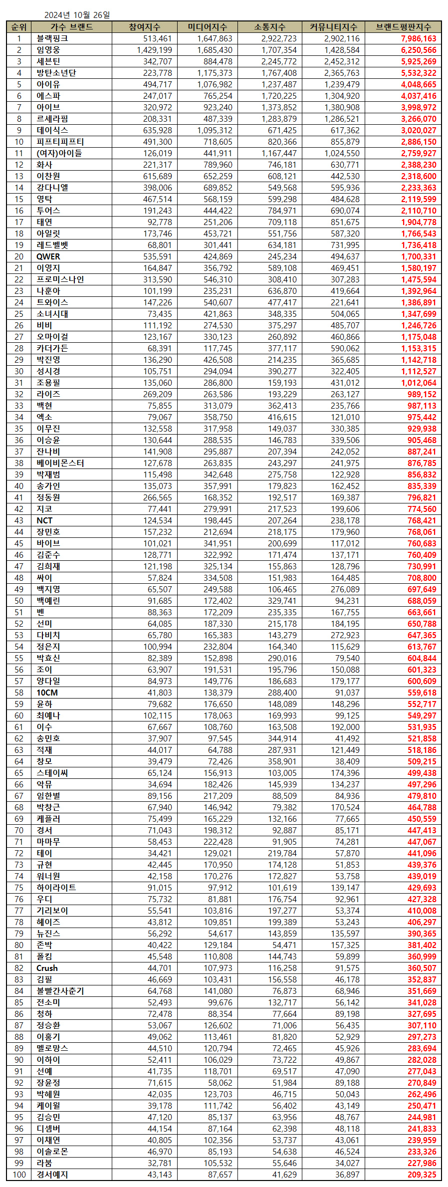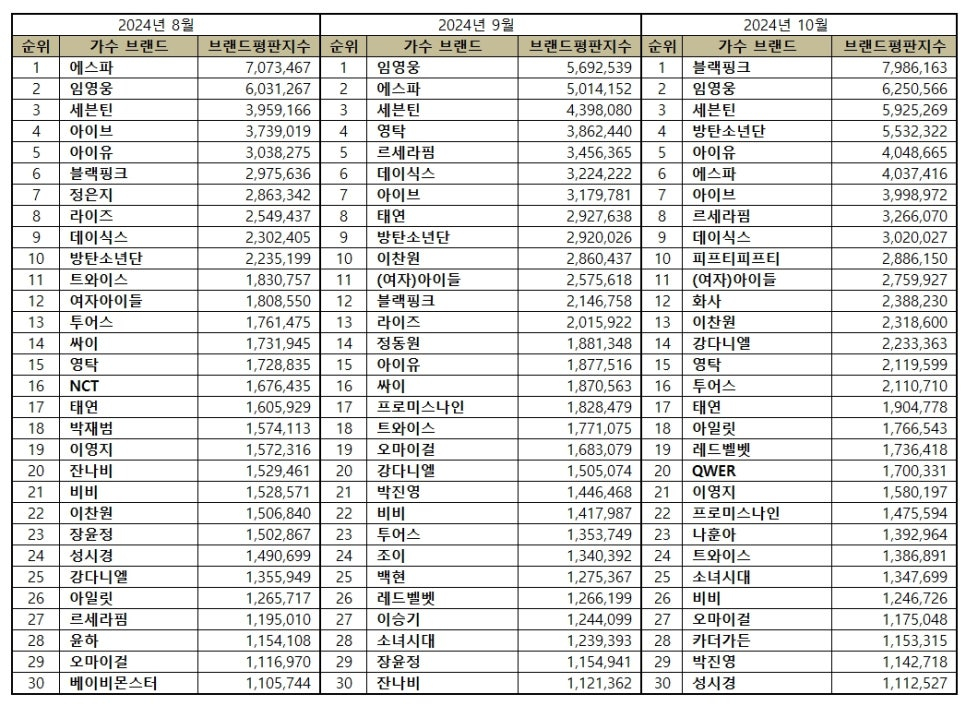 2024년 10월 가수 브랜드평판 30위 순위는 블랙핑크, 임영웅, 세븐틴, 방탄소년단, 아이유, 에스파, 아이브, 르세라핌, 데이식스, 피프티피프티, (여자)아이들, 화사, 이찬원, 강다니엘, 영탁, 투어스, 태연, 아일릿, 레드벨벳, QWER, 이영지, 프로미스나인, 나훈아, 트와이스, 소녀시대, 비비, 오마이걸, 카더가든, 박진영, 성시경 순으로 분석됐다.