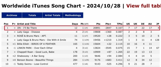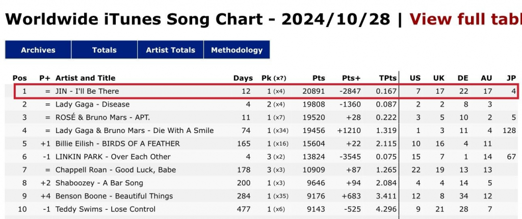 진의 'I'll Be There'는 글로벌 음악 스트리밍 서비스 타이달(TIDAL)의 데일리 톱 비디오 미국 차트에서도 1위를 기록하며 뜨거운 인기를 입증했다.