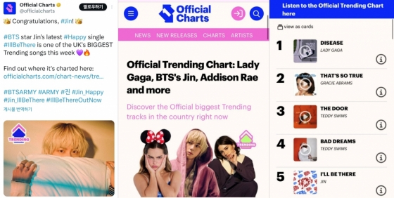 'I'll Be There'는 영국 오피셜 트렌딩 차트 5위에 올랐다. Official Charts 공식 X(옛 트위터) 계정은 방탄소년단 스타 진의 'I'll Be There'가 이번 주 영국에서 가장 큰 트렌드 곡 중 하나라며 축하했다.