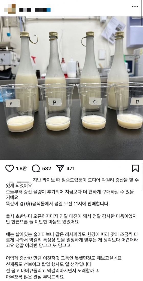 더불어 "'경탁주 12도'는 토, 일, 공휴일 제외하고 평일 오전 11시에 판매되고 있다"라며 "구매를 놓치신 경우, 다음 날에도 동일하게 판매하니 많은 관심 부탁드린다. 항상 진심으로 감사드린다"라고 구매 방법을 덧붙였다.
