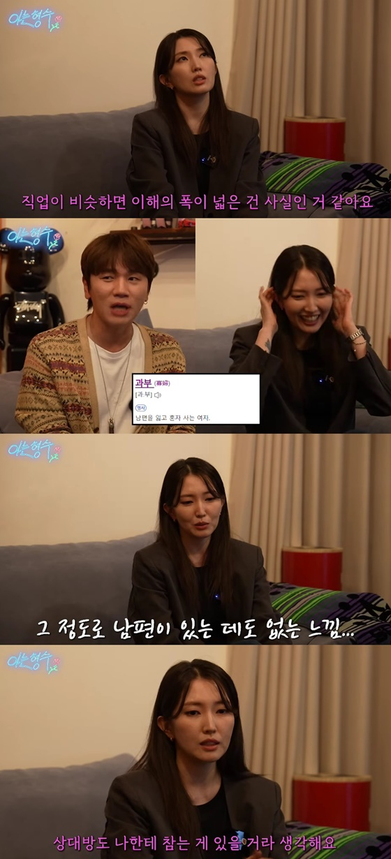 이에 김윤주는 "동료애 있다. 직업이 비슷하면 이해의 폭이 넓은 건 사실이다. 횟수로 (결혼) 11년 차다. 한 8년 전 정도까지는 집에 새벽 네다섯 시쯤에 들어왔다. 그런데 그 후에 내가 약간 '나 과부인가?' 생각이 들더라. 그만큼 (남편이) 없는 사람처럼 혼자 있더라. 그래서 이게 뭐지? 라는 생각이 들었다"고 털어놔 웃음을 자아냈다.