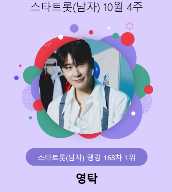 영탁은 24일 오후 3시 1분부터 31일 오후 3시까지 진행된 10월 4주(168차) 스타랭킹 스타트롯 남자 랭킹에서 8만 3240표를 받으며 1위를 차지했다.