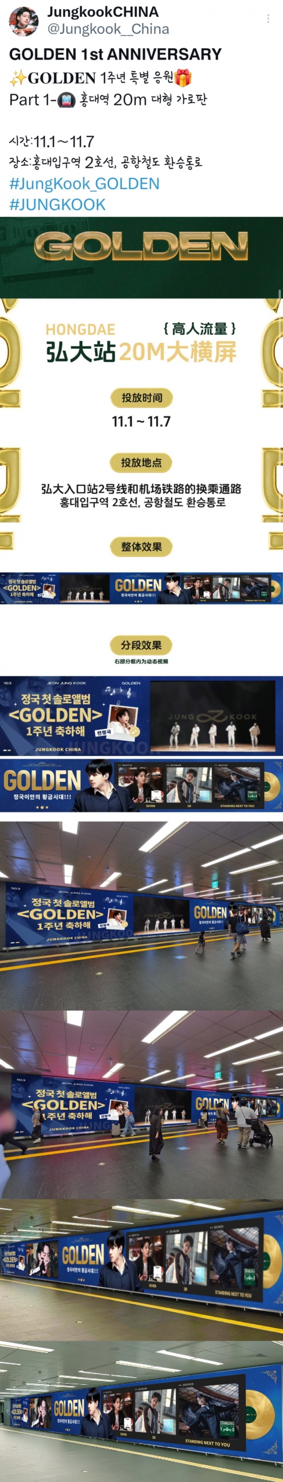 정국 팬클럽 '정국 차이나'는 소셜미디어 엑스(X·구 트위터)를 통해 첫 솔로 앨범 'GOLDEN'(골든)의 발매 1주년을 기념해 준비한 특별 응원 서포트를 공개했다.