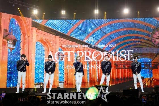 연예K-POPTXT 'ACT : PROMISE' 개최[★포토]발행 : 2024.11.03 ・ 17:48김창현 기자보이 그룹 투모로우바이투게더(TOMORROW X TOGETHER)가 3일 오후 서울 송파구 방이동 올림픽공원 KSPO DOME에서 진행된 세 번째 월드투어 서울 앙코르 콘서트 'TOMORROW X TOGETHER WORLD TOUR ENCORE IN SEOUL'에서 멋진 무대를 선보이고 있다. / 사진제공=빅히트뮤직<저작권자 © 스타뉴스, 무단전재 및 재배포 금지>투로모우바이투게더TXT투바투콘서트월드투어ACT추천 기사김창현 기자기자홈좋아요 연예-K-POP의 인기 급상승 뉴스연예-K-POP의 최신 뉴스