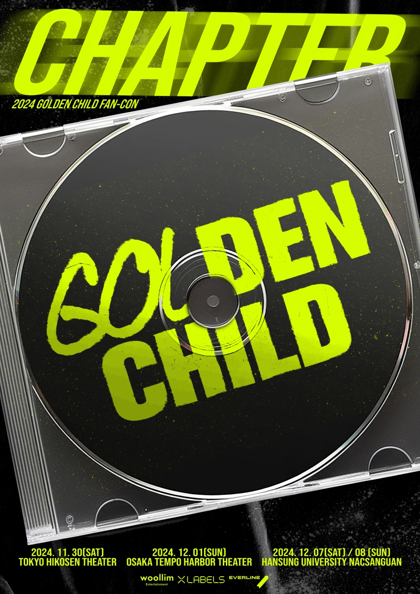 울림엔터테인먼트가 공개한 포스터는 어두운 배경 속 투명 케이스에 담긴 CD가 놓여 있는 유니크한 이미지로 시선을 끌었다. 여기에 톡톡 튀는 강렬한 라임 컬러로 골든차일드 그룹명과 팬콘서트 타이틀, 일시와 장소까지 빼곡하게 적혀 있다.
