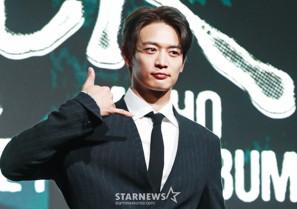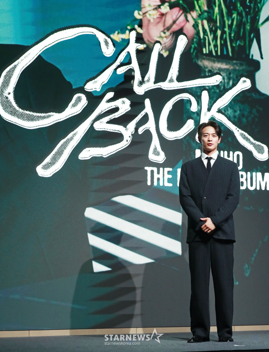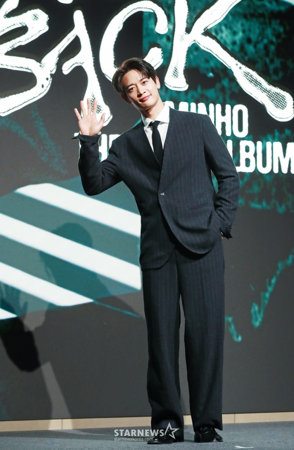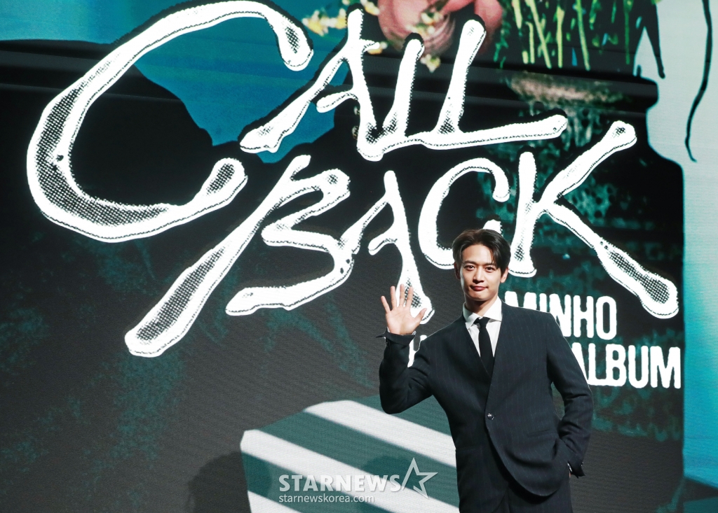 민호는 4일 오전 서울 영등포구 여의도동 페어몬트 앰배서더 서울 그랜드볼룸에서 첫 번째 정규앨범 '콜 백(CALL BACK)' 발매 기념 기자간담회를 개최했다. 진행은 민호와 절친 사이로 유명한 동방신기 최강창민이 맡았다.