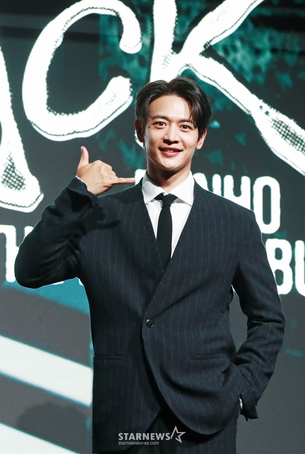민호는 4일 오전 서울 영등포구 여의도동 페어몬트 앰배서더 서울 그랜드볼룸에서 첫 번째 정규앨범 '콜 백(CALL BACK)' 발매 기념 기자간담회를 개최했다. 진행은 민호와 절친 사이로 유명한 동방신기 최강창민이 맡았다.