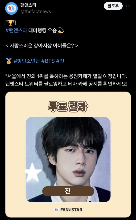 방탄소년단(BTS) 진이 '사랑스러운 강아지상 아이돌' 1위에 오르며 독보적 매력을 다시 한번 뽐냈다.