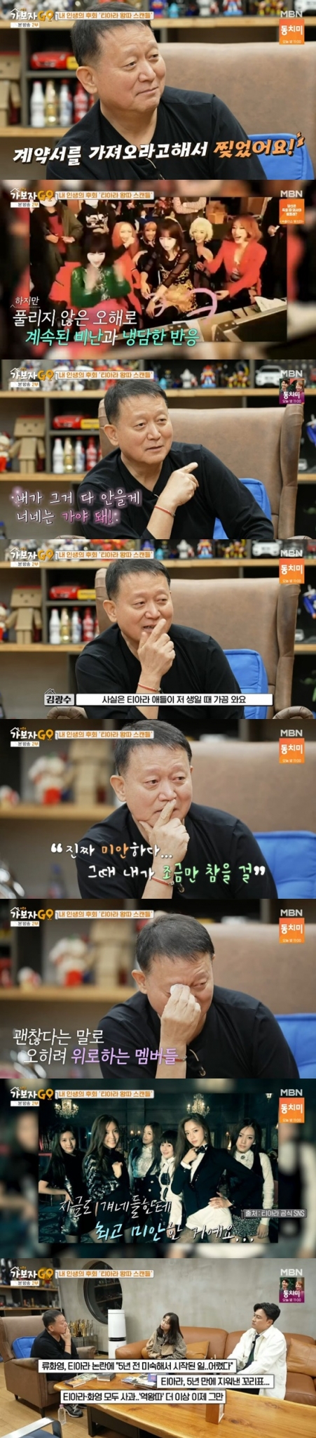 앞서 김광수 대표는 지난 9일 MBN '가보자GO'에 출연해 2012년 '티아라 왕따 사태' 에 대해 언급하고 "당시 티아라 멤버들이 피해자였지만 내 처신으로 인해 가해자가 됐다. 40년 엔터 세월 중 가장 후회가 되는 일"이라고 말하며 눈물을 흘렸다. 김광수 대표는 "내가 생각할 때 티아라는 잘못이 없어서 방송을 강행했다. 그런데 대중은 '김광수가 얼마나 막강하면 방송을 강행하냐'라고 했다. 화영 효영 걱정하다 내가 나락으로 갔다. 티아라를 만나면 제가 미안해서 운다. 이 아이들이 더 전성기를 갈 수 있었는데 한 사람의 판단이 이 아이들의 인생을 망가트렸나 싶다. 10년이 넘은 일인데 논란이 지금도 진행 중이라고 생각한다. 40년간 엔터 일을 하면서 최고로 후회되는 일"이라고 말했다.