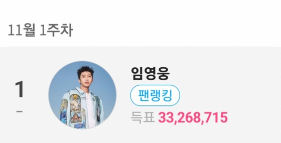 임영웅은 2024년 11월 1주차 팬앤스타 솔로 랭킹에서 3326만 8715표를 획득해 1위를 기록했다.