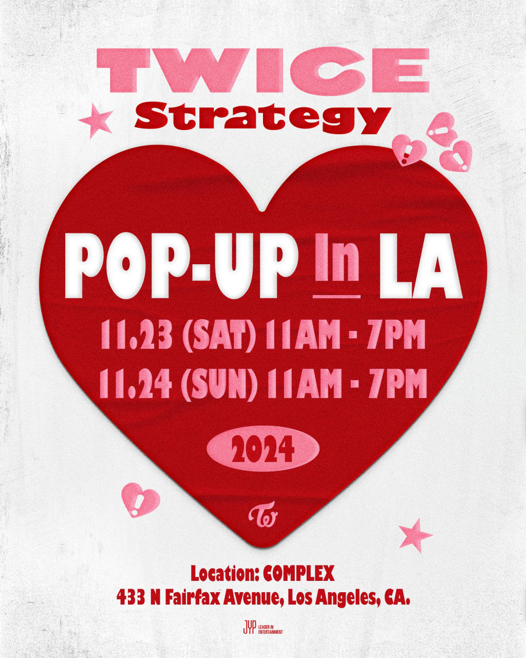 트와이스는 11월 23일~24일(이하 현지시간) 미국 로스앤젤레스에 위치한 COMPLEX(콤플렉스)와 12월 4일~12일 서울 영등포구 더현대 서울 5층 EPIC SEOUL(에픽 서울)에서 '[TWICE "STRATEGY" POP-UP]'(트와이스 "스트래티지" 팝업)을 연다. JYP엔터테인먼트는 11일 오후 공식 SNS 채널에 러블리한 분위기의 모션 포스터와 이미지를 공개하고 기대감을 높였다.