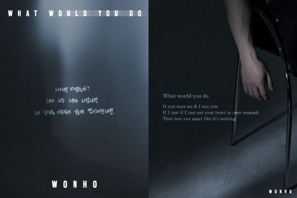 여기에 '너라면 어땠을까?', '내가 너고 네가 나였다면', '네 심장을 아무렇지 않게 찢어버린다면'이라는 가사 일부가 한글과 영어로 적혀 있어 원호가 '왓 우드 유 두'를 통해 새롭게 보여줄 감성에 대한 기대감을 높였다.