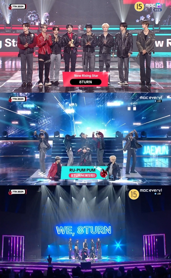 이날 8TURN은 활발히 활동하며 주목 받은 신인 아티스트에게 주어지는 '뉴 라이징 스타상'을 받았다. 트로피를 받으며 기쁨을 안은 8TURN은 "올해 다양한 도전을 했는데 이렇게 멋진 상을 받아서 기쁘다. 믿고 응원해 준 팬들에게 너무 고맙다. 앞으로도 더 열심히 연습하면서 멋진 모습 보여드릴 수 있도록 하겠다"고 소감을 전했다.
