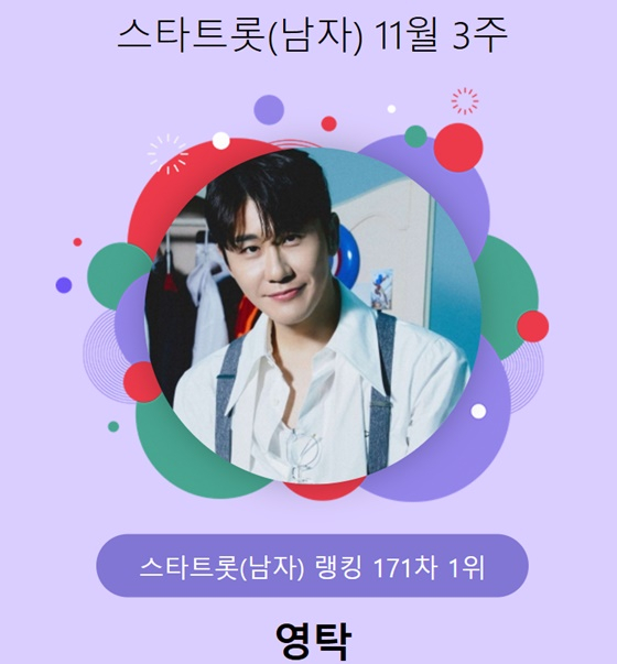 영탁은 지난 14일 오후 3시 1분부터 21일 오후 3시까지 진행된 11월 3주(171차) 스타랭킹 스타트롯 남자 랭킹에서 9만2515표를 받아 1위에 올랐다.