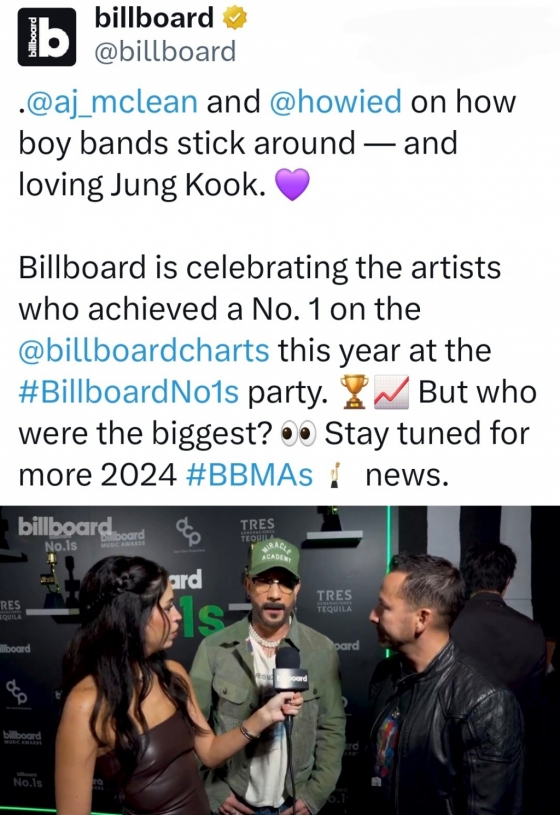 영상에서 인터뷰어는 '백스트리트 보이즈'에게 "2024년 넘버1 아티스트는 누구라고 생각합니까?"라는 질문을 했고, A.J. 맥린은 "요즘 새롭고 훌륭한 아티스트들이 너무 많다"며 "요즘 나는 정국의 '열렬한 팬'(Big Big Fan)이다"라고 정국에 대한 애정을 나타냈다.