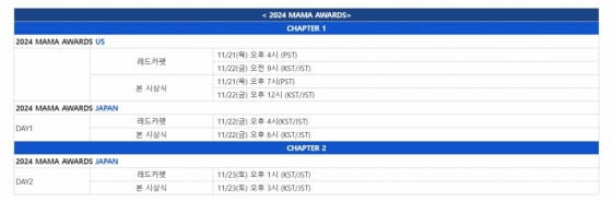 한편, '2024 MAMA AWARDS'는 한국 시간으로 오는 11월 22일 낮 12시 미국 LA 돌비씨어터에서 시상식이 열리며, 같은 날 22일 오후 4시 일본 교세라 돔 오사카에서 레드카펫으로 챕터1이 시작된다. 23일 챕터2는 오후 1시에 레드카펫이, 오후 3시부터 시상식이 진행될 예정이다. '2024 MAMA AWARDS' 현장 생중계는 Mnet뿐 아니라 유튜브 채널 Mnet K-POP을 비롯해 엠넷플러스(Mnet Plus) 등을 통해 시청 가능하다.